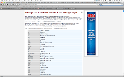 I was pretty cool in the fifth grade when I would form a "W" with my hands to oppose another person or raise my palm out to someone and tell them to "talk to the hand" when they said something I didn't agree with, but these acronyms are on a completely different level. If I were a teenager now —which I assume are the majority of text acronym users— I would need a little print out of the list next to my computer to remember all of them.
